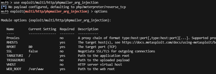 进去后默认是没有配置的,需要我们手动添加,如set WEB_ROOT /var/www/html,主要就是配置一下RHOSTS,TARGETURI,WEB_ROOT