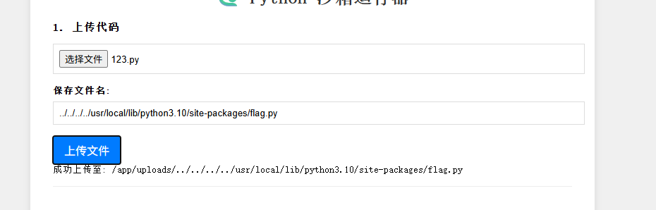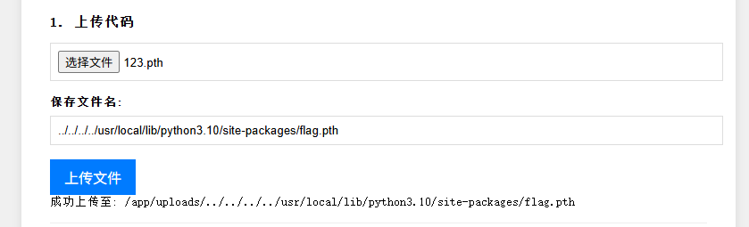这里没有做任何的限制,是可以直接进行路径拼接的,比如我文件名命名为 ../../../../usr/local/lib/python3.10/site-packages/read.py,那么最后给拼接后的路径就是/app/uploads/../../../../usr/local/lib/python3.10/site-packages/read.py,即存到了site-packages目录
